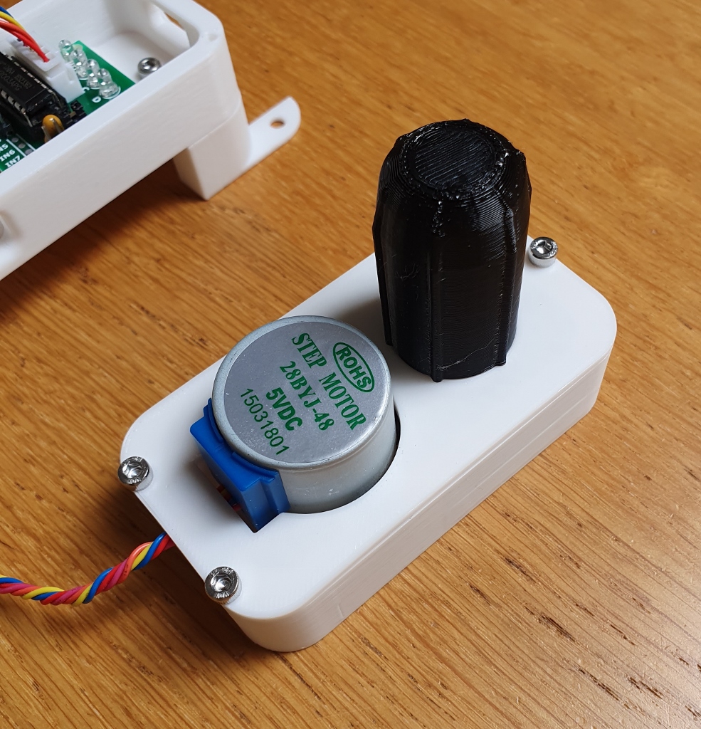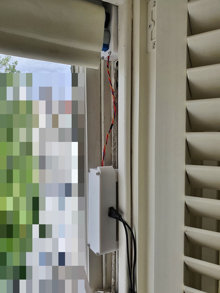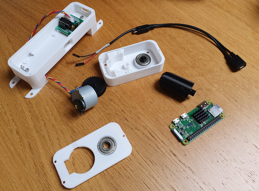 I've printed the case in white biodegradable PLA to blend with the white windowframe, and the drivechain in black PETG for its better mechanical properties. I chopped the end off a micro-USB Y-splitter and soldered some jumper connectors to it to power both the Darlington array and the Raspberry Pi from the same PSU without drawing too much current through the GPIO port. The cases use M3 screws and the PCBs are held down by M2.5 screws.