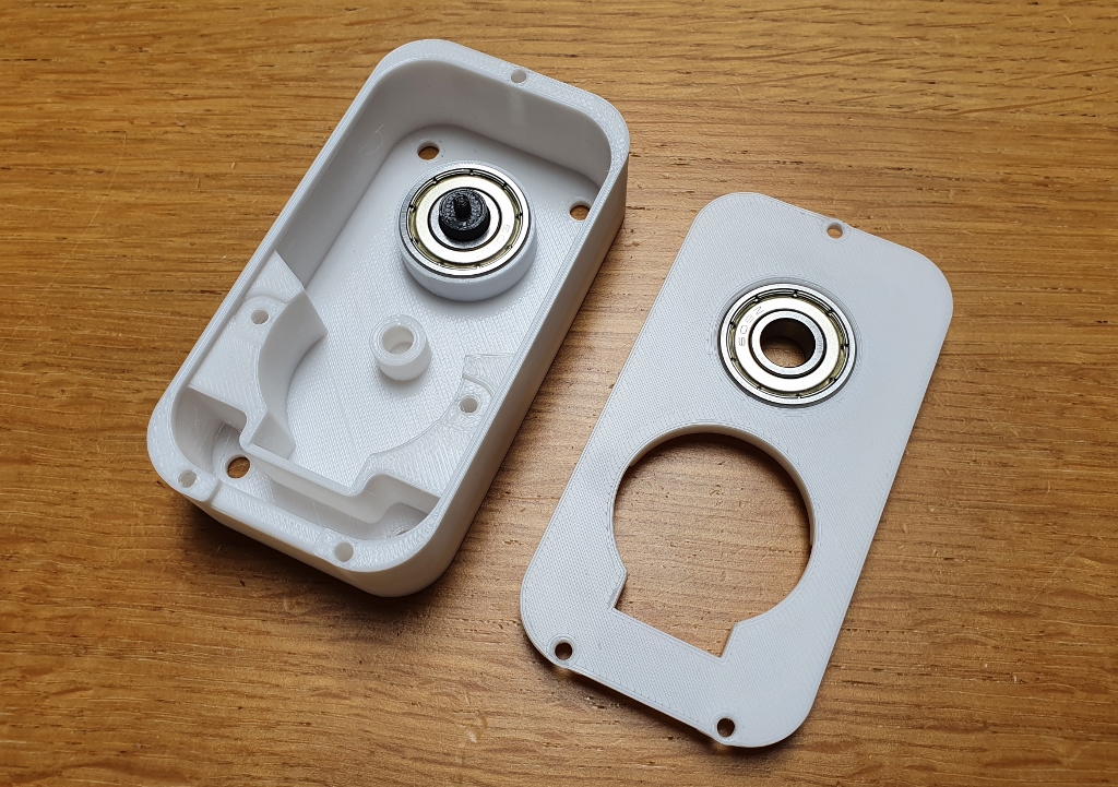 The motor module is slim enough to replace the beaded string winder. The drive shaft sits on a pair of skateboard bearings.