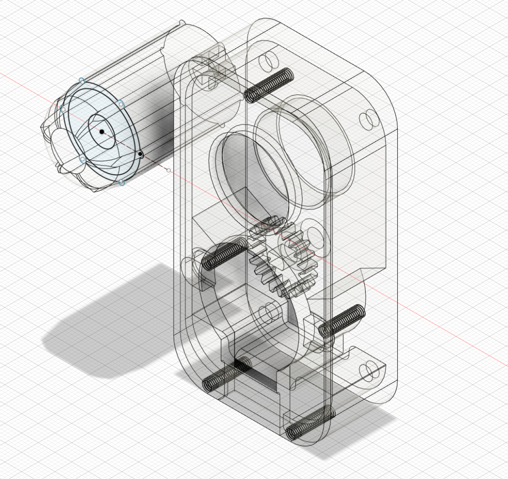 After experimenting with several unsatisfactory CAD packages, I discovered that Autodesk Fusion 360 is free for personal use. Don't bother with anything else - it's excellent. I designed this case, gears and drive train in half a day. The motor is geared down 2:1.